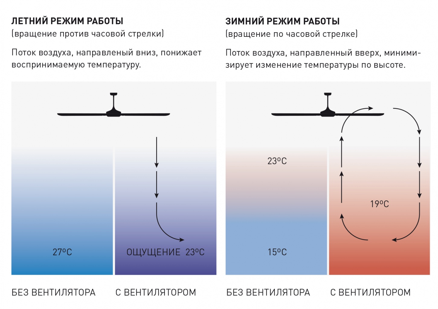 Потолочный вентилятор переносит теплый воздух, смешивая его с прохладным, что позволяет создать равномерную температуру во всем помещении.