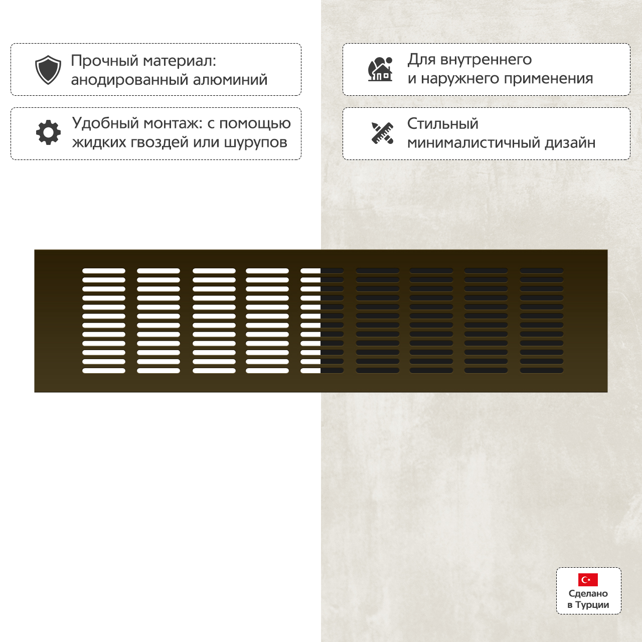 Прямоугольная вентиляционная решетка изготовлена из анодированного алюминия.