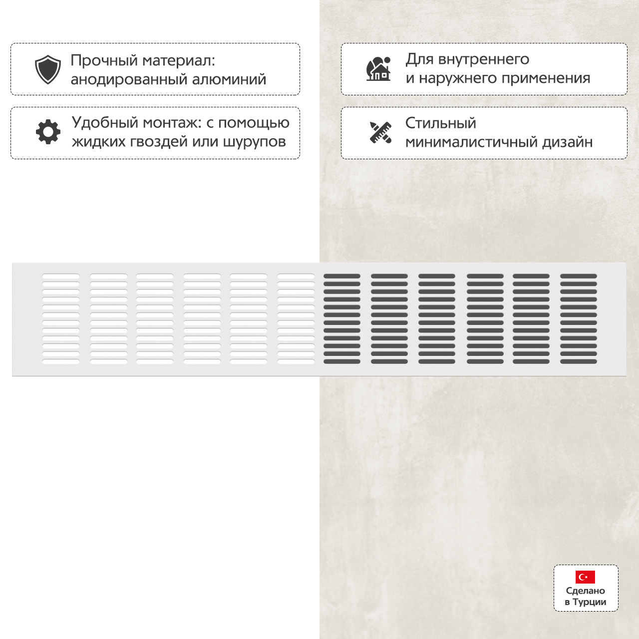 Прямоугольная вентиляционная решетка изготовлена из анодированного алюминия.