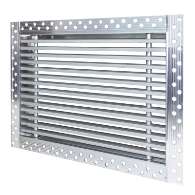 Данная решетка подходит для монтажа на любую поверхность под финишную отделку. Рамка и экран изготовлены из алюминия, опора экрана - из оцинкованной стали. Рама оснащена «полкой» 1,9 мм и рифлеными краями для большей адгезии финишного материала – шпатлевки, цемента. Решетка имеет съемную центральную часть с фиксированным углом наклона ламелей 0°. Она крепится к корпусу прочными металлическими тросиками, легко снимается для очистки и удобного обслуживания.
