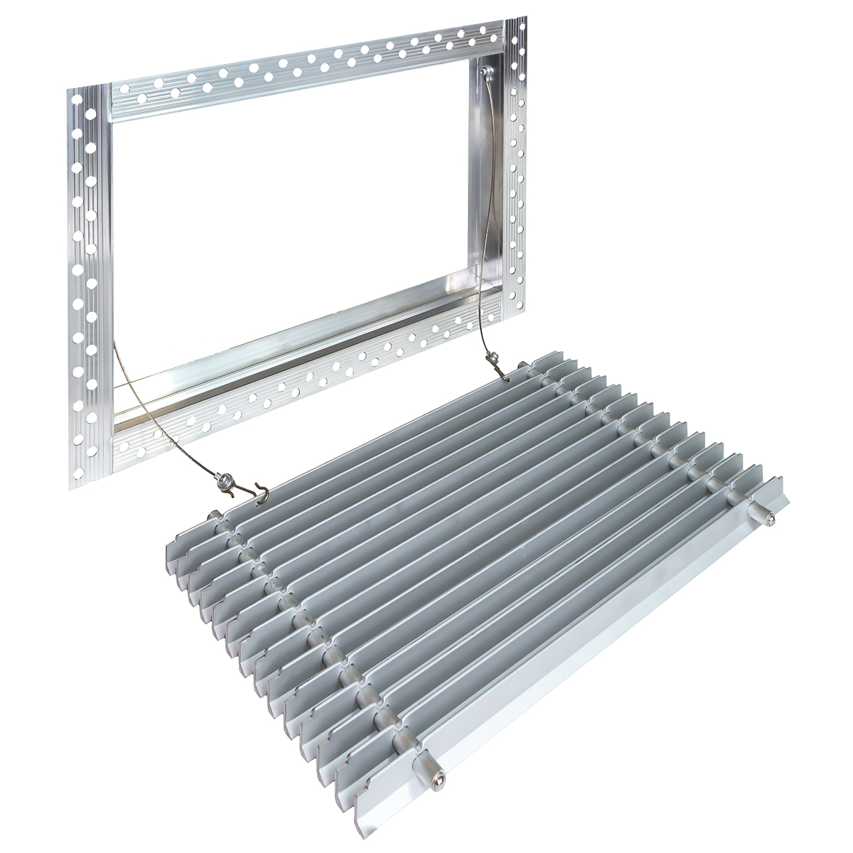 Данная решетка подходит для монтажа на любую поверхность под финишную отделку. Рамка и экран изготовлены из алюминия, опора экрана - из оцинкованной стали. Рама оснащена «полкой» 1,9 мм и рифлеными краями для большей адгезии финишного материала – шпатлевки, цемента. Решетка имеет съемную центральную часть с фиксированным углом наклона ламелей 15°. Она крепится к корпусу прочными металлическими тросиками, легко снимается для очистки и удобного обслуживания.