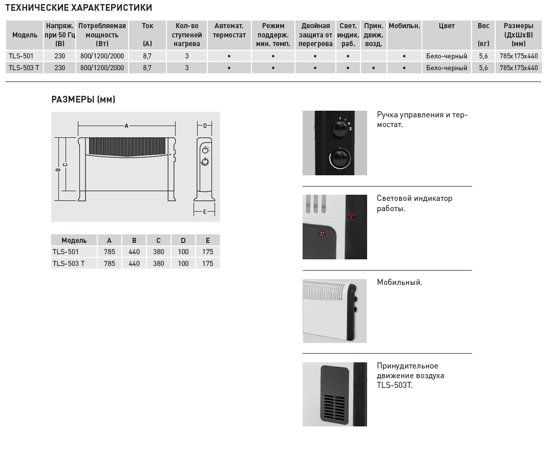 Для увеличения потока воздуха через конвектор, модель TLS-503 Т укомплектована встроенным вентилятором на передней панели.