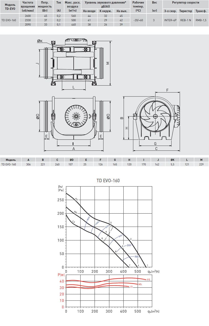 Максимальные рабочие характеристики моделей TD-EVO-VAR соответствуют кривой “HS” на графиках рабочих характеристик вентиляторов TD-EVO.