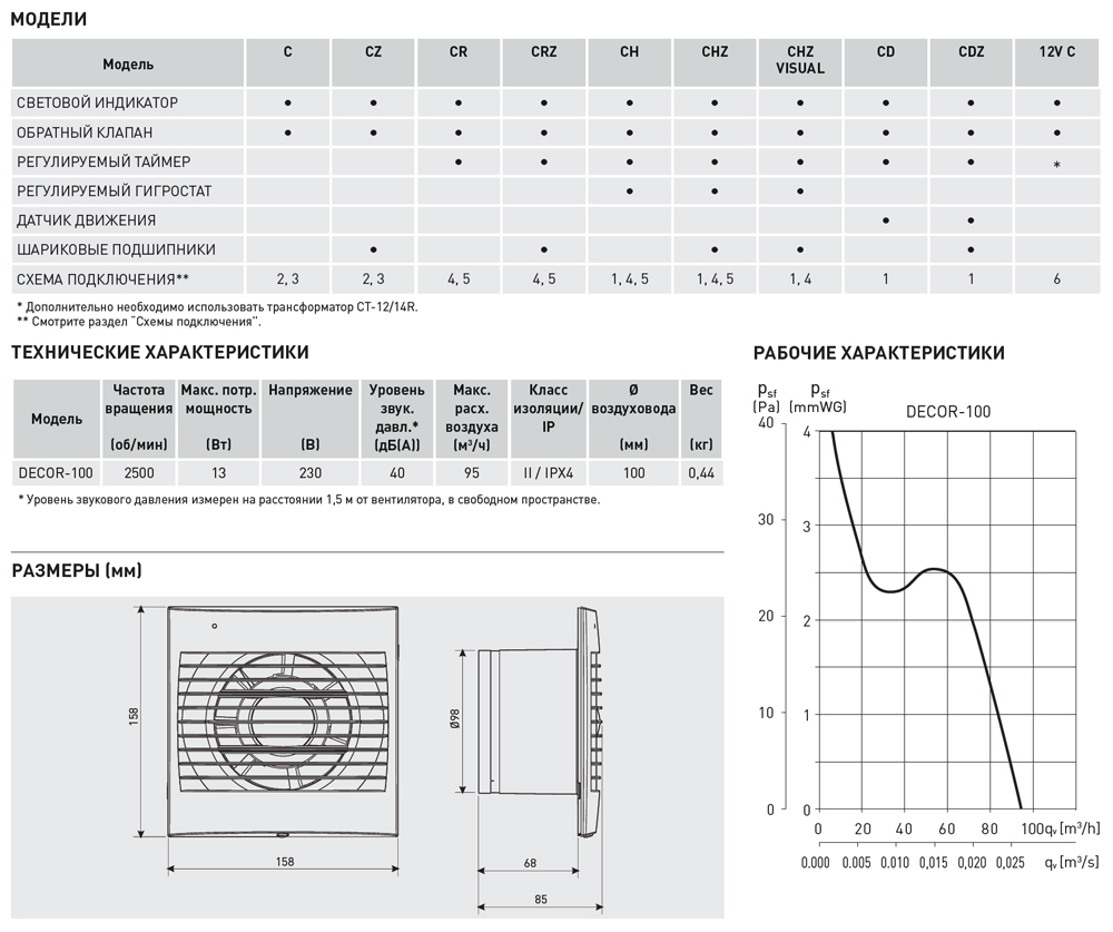 Модель разработана специально для душевых и ванных комнат. Напряжение питания вентилятора составляет 12 В, класс защиты IP57, класс электробезопасности III. Для работы вентилятору DECOR-100 C 12V требуется понижающий трансформатор CT-12/14. Трансформатор следует устанавливать вне помещения с повышенной влажностью. Класс защиты трансформатора IP21, класс электробезопасности II, оснащен предохранителем. Трансформатор CT-12/14 R оснащен регулируемым таймером отключения (1-30 мин.) Вентилятор выключается по прошествии времени, заданного на таймере.