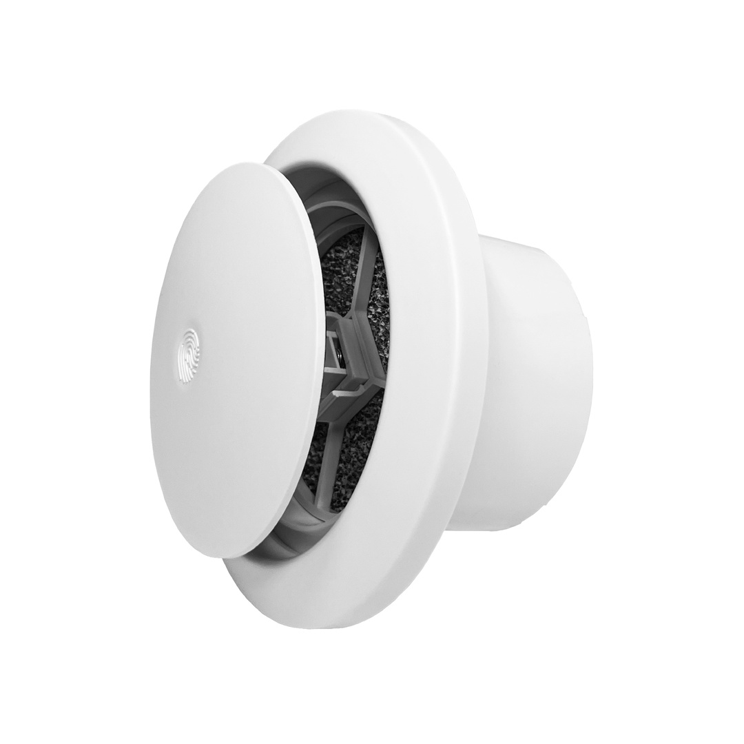 Диффузор имеет встроенный фильтр и шумопоглащающую вставку на воздухораспределительной части. Регулировка расхода воздуха осуществляется путем нажатия на центральный диск (3 степени открытия).
